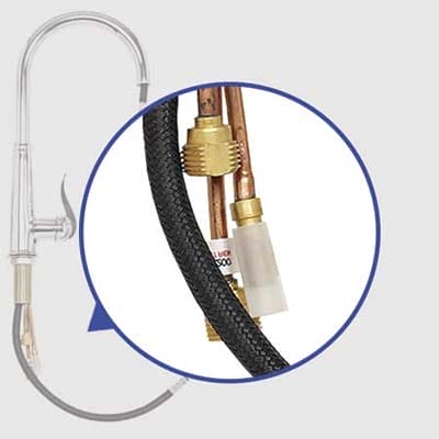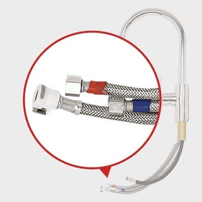 Brass fittings on copper tubes; steel hoses for water-supply connection are