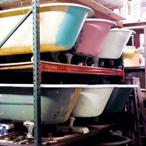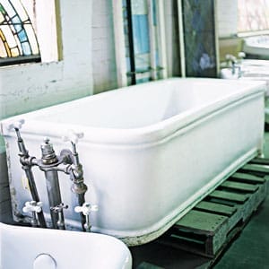 Freestanding cast-iron tubs are the most common type you’ll find at salvage yards today. China and earthenware tubs are heavier and often had at least one side that was attached to a wall, making them difficult to remove without damaging them, says Don Hooper, owner of Vintage Plumbing in Northridge, California. “You can’t just grab the rim and lift it up like you do with a cast-iron tub,” he says. “Many people take them out the easy way, with a sledgehammer and wheelbarrow.”