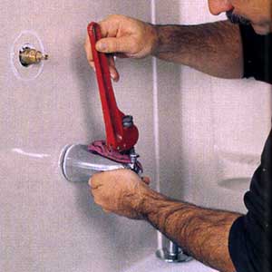 Start by removing the existing faucet handles, escutcheons, showerhead and tub spout. Look for a hex-head set screw on the underside of the tub spout. Loosen it with a hex-key wrench and pull the spout straight out. If there is no screw, the spout is threaded on. Cover it with a cloth and twist it off counterclockwise with a pipe wrench (photo 1), or insert a wood plunger handle in the spout itself and turn it counterclockwise.