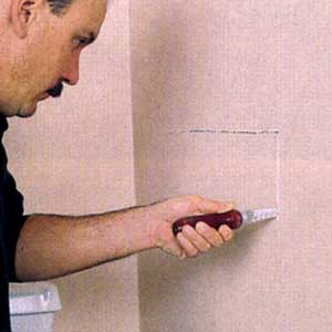 Next, cut an opening in the back side of the plumbing wall with a drywall saw (photo 2); gently pry out the piece and save it. Go from stud to stud (about 141/2 in. wide) and from 6 in. above the faucet handles to 8 in. below the tub spout. Keep in mind that a larger wall opening makes it easier and safer to solder; what’s more, it’s no more difficult to repair than a smaller opening.