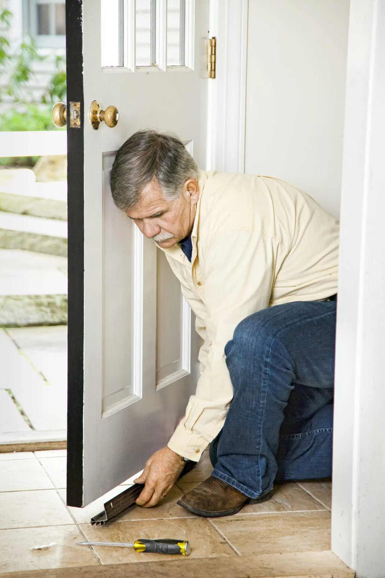 - Apply weatherstripping to the sides and top of the door frame.